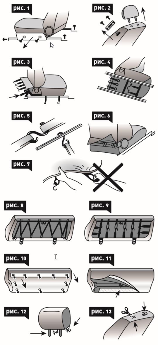 а) Натянуть чехол на заднее сиденье, заводя шнур за рычаги крепления сиденья к полу. Резинки соединить друг с другом и прикрепить к каркасу сидения крючками, (рис. 9). Шнур по контуру сильно стянуть, завязать. Если чехол оснащен петлями, то при помощи дополнительного шнура (не входит в комплект), следует стянуть петли шнуром навстречу друг к другу (рис. 8).